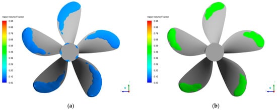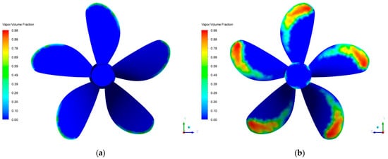The best representation of the occurrence of cavitation is the vapor fraction as a result of the numerical model. The proportion of vapor present in the two-phase mixture is visualized with respect to the liquid phase. A value of 1 or close to this number will show that vapor bubbles are fully formed and cavitation is happening. Figure 16 depicts the different values of vapor volume fraction present on both sides of the optimized propeller. In Figure 16a, a low volume fraction at the propeller tips can be observed, while in Figure 16b a wide range of values for the vapor volume fraction can be observed; this means the suction side is the surface of the propeller with the higher probability of having cavitation. The areas with the cooler shades signify a null or lower vapor fraction, whereas warmer colors signify a higher presence of vapor fraction, or in other words cavitation.