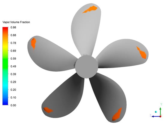 Cavitation occurs when the local pressure drops below the vapor pressure of the liquid at the corresponding temperature. Propeller blades are exposed to local lift forces that can lead to low-pressure peaks. When the surrounding water pressure drops below the vapor pressure, cavities or bubbles will form. Because of their specific geometry and the rotational conditions in which marine propellers operate, cavitation is likely to occur [,]. Cavitation phenomena, when present, can lead to safety problems, major repair and maintenance costs, and additional hydrodynamic energy losses [,].