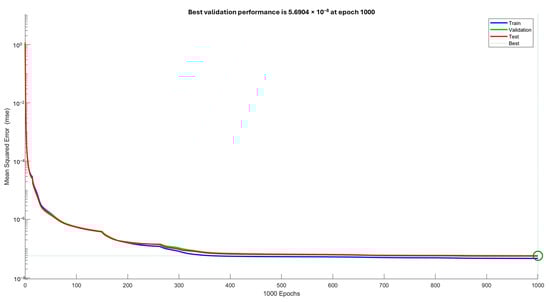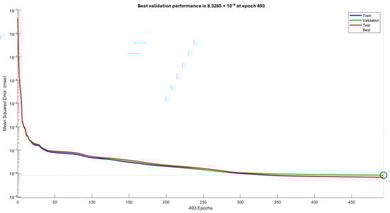 Polynomials for retrieving KT and KQ coefficients for the Wageningen B-series propeller were first introduced by Oosterveld and Oossanen []; since then they have been used as the primary means to obtain these values, together with corresponding plots. Comparatively, in a similar way to how polynomials were developed through multiple regressions in order to fit experimental data, nowadays neural networks (NN) can be trained with a set of data points in order to predict the same coefficients. Data from [,] were used to train two independent neural networks using MATLAB® with the parameters seen in Table 13. The performance in training neural networks for KT and KQ is shown in Figure 19 and Figure 20, respectively; end of training is marked with the green circle.