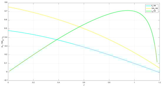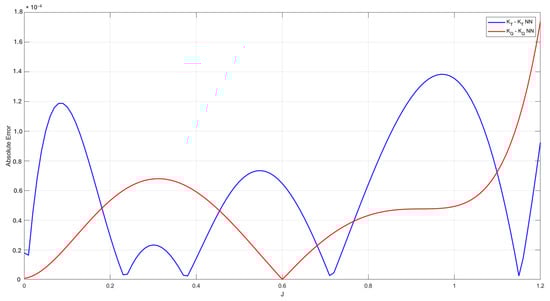 In order to compare the results from using polynomials and neural networks, coefficients and efficiencies were plot corresponding to Wageningen B-series for Z, AE/A0, and P/D using the suboptimal parameters obtained from the NSGA-II algorithm. Figure 21 shows a plot using polynomials, Figure 22 shows a plot using neural networks, and Figure 23 depicts the absolute error between the polynomial and neural network estimations for KT and KQ. From Figure 23, it can be observed that errors fell within a range of 10−4 in this specific case.