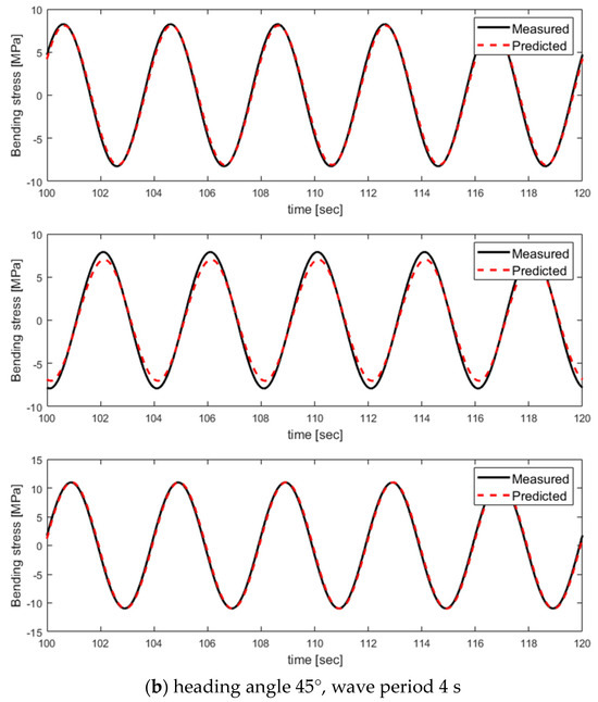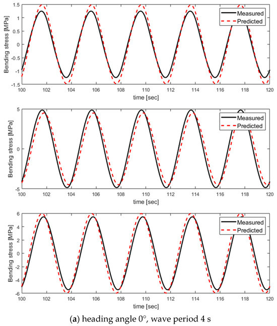 After comparing the results of the numerical analysis, we analyzed the prediction results based on the model experiment results for each of the input sensor candidate groups. Figure 7 shows the results of the bending stress prediction for each of the input sensor candidate groups based on the model experiment results. The overall bending stress prediction accuracy was lower than the prediction accuracy of the results of the numerical analysis, and notably, there was a slight phase difference with the results of the model experiment. This may be because the structural characteristics of the model were changed due to the limitations in constructing an ideal model. Based on the finding that the mean relative error was largest in the second candidate group composed of only the structural members of a single unit structure. It was analyzed that the motion response characteristics of the actual model changed due to the hinge connection, and as a result, the structural response was out of phase with the numerical analysis. The comparison between the results of the numerical analysis and the results of the model experiment showed a phase difference in the structural response between the front unit structure and the rear one. So, the phase difference in structural response between the numerical analysis and model test was calculated and the phase difference was corrected by shifting it. Furthermore, the high-frequency components and the noise components of the measurement data obtained from the model experiment may have affected the performance of conversion matrix response because it is mixed with the small structural response, thereby increasing the mean relative error. Therefore, in this study, band-pass filtering was applied to remove frequency components above 10 Hz.