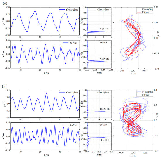 The effect of the planar motion of buoyancy on VIV is investigated in this paper. The experimental results of the buoyancy can are filtered to eliminate the high-frequency motions of pitch and roll and obtain the planar VIM. Figure 3 shows the VIM results of the buoyancy can in the cross-flow and in-line directions at three flow velocities, i.e., 0.14 m/s, 0.26 m/s, and 0.44 m/s, respectively. The results include time-history motion, FFT spectral density curves, and motion trajectories in two directions. The system identification method is applied to improve the recognition of the motion trajectory [33].