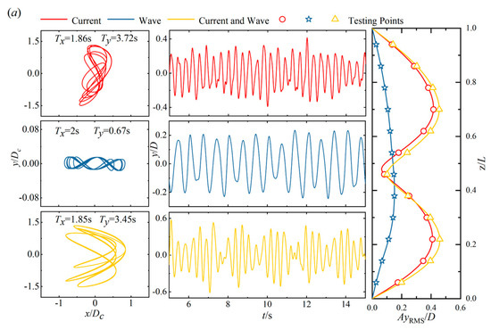 The VIM and VIV results of the combined model at different conditions, i.e., isolated current, isolated wave, and combined wave and current, respectively, are depicted in Figure 8. The left-side subfigures show the planar motion trajectories and the motion periods of the buoyancy can; the middle three subfigures present the time-history displacements of the same riser position as Figure 5; and the right-side subfigures show the RMS amplitudes along the riser.