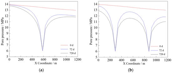 Figure 6a displays contour maps of the pore pressure along Section 1 in the slope after production using scheme X2 under 6 MPa for 720 d. In the figure, the pressure drop spreads radially around the wellbore, thus forming a cylindrical high-pressure-drop region with the wellbore as the axis and a radius of 50 m. Because the effective porosity and permeability of the NGH reservoir increase significantly after NGH decomposition and production, the pore pressure propagates anisotropically in the slope, and the propagation velocity of the low pressure in the NGH reservoir is much faster than that in the overlying and underlying strata. Figure 6b shows contour maps of the pore pressure using scheme X5 under the same conditions, and its comparison with Figure 6a reveals that the pressure drop of each well propagates in the same manner, while the superimposed effect of the pressure drop is enhanced with the narrowing of the well spacing. Moreover, a comparison of the contour maps of the pore pressure and the NGH saturation also shows that the NGH decomposition zone is located within the high-pressure-drop range of the pore pressure and that the two have some correlations.