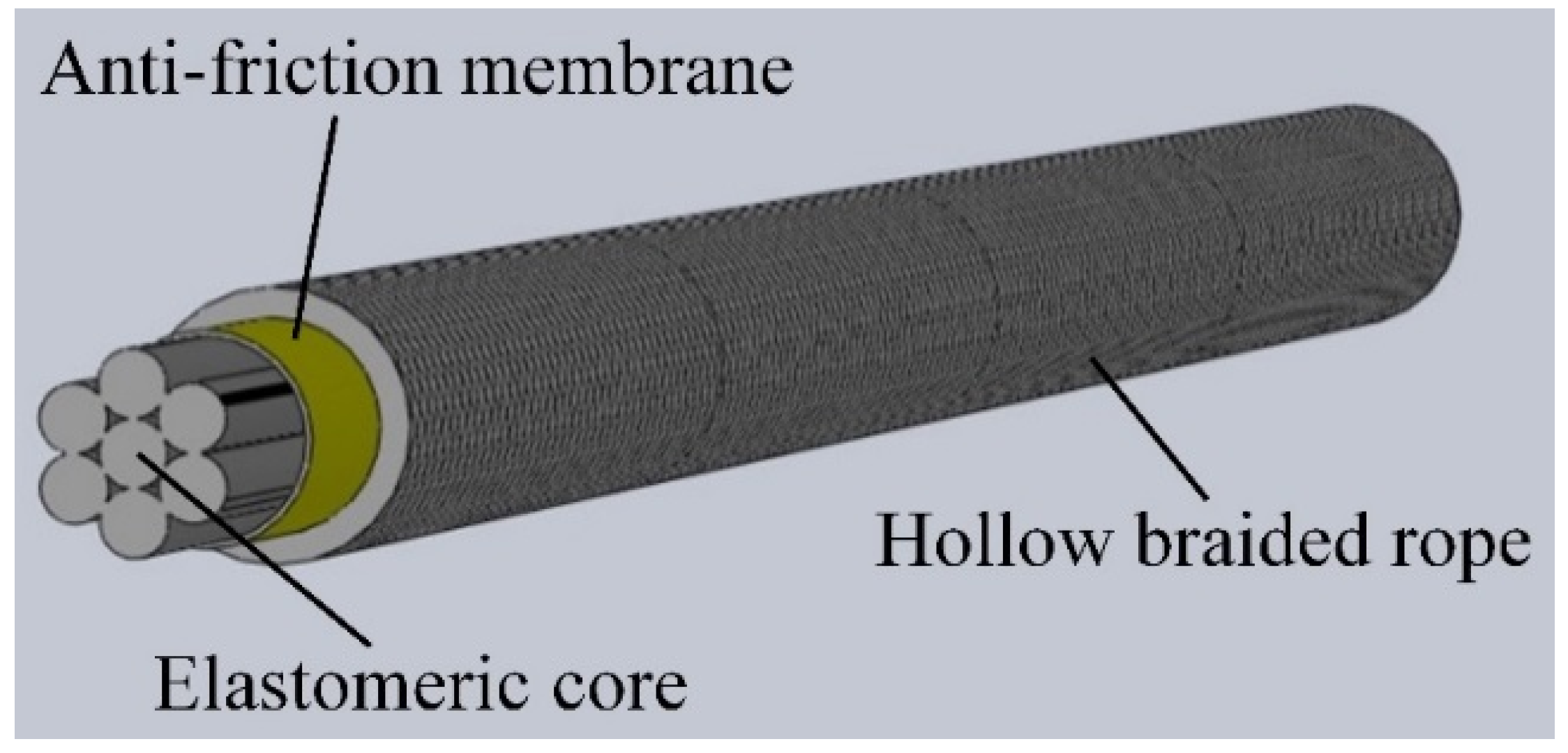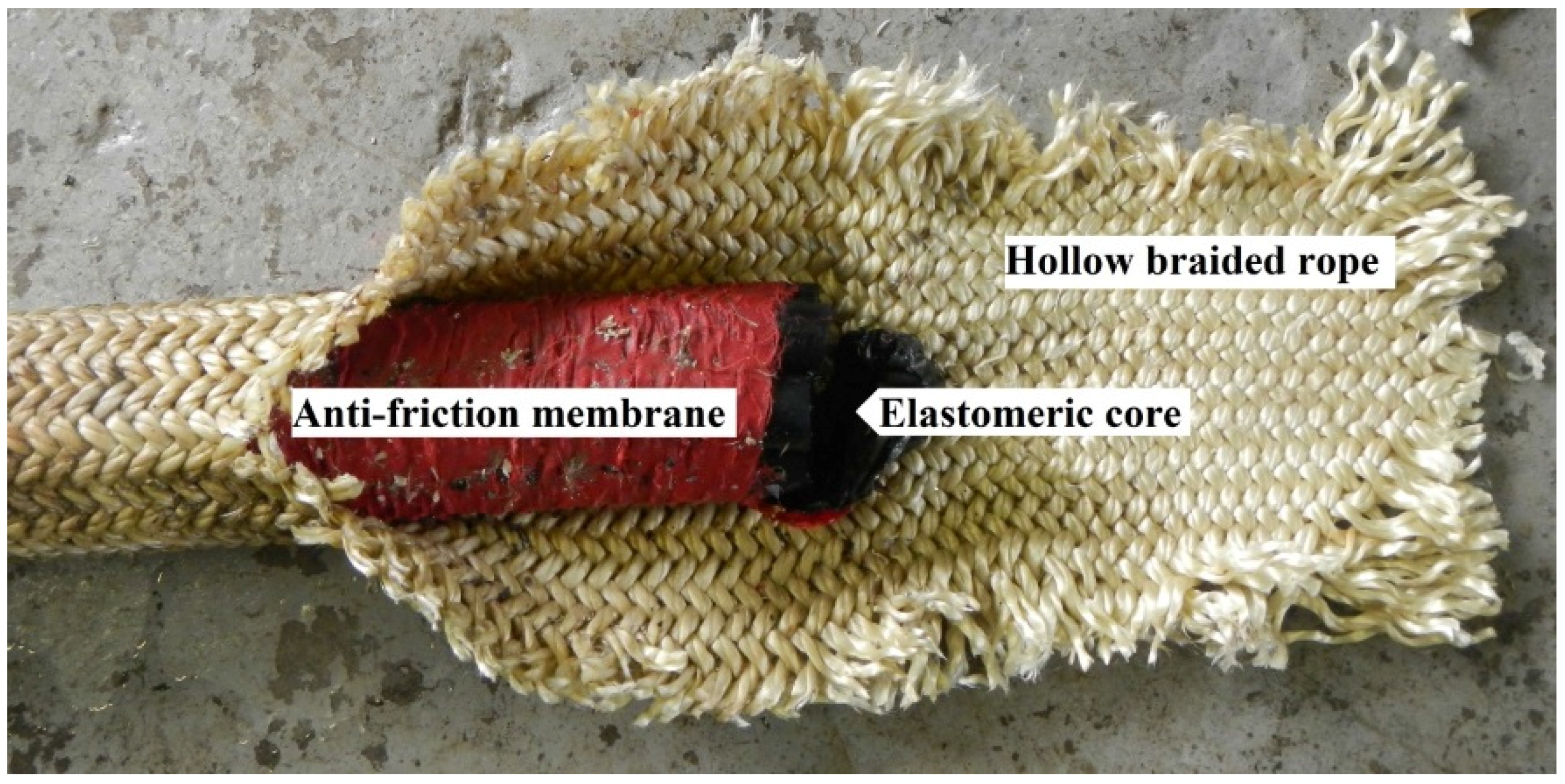 The Exeter Tether [16,17] is a tether assembly comprising a hollow braided fibre rope, an elastomeric core assembly and at least one anti-friction membrane between the rope and the core (see Figure 1).