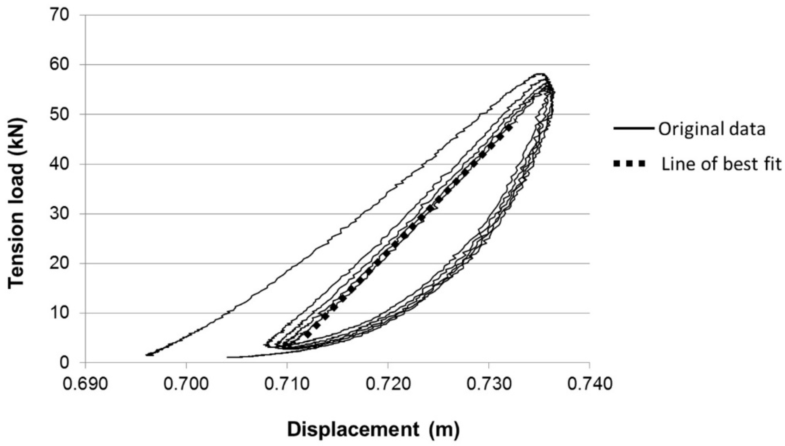 The tethers yield significantly upon initial loading, taking on a temporary extension “set”. For this analysis, the extension results are referenced to a “dynamic zero load length” that better represents the free length of the tether during cyclic loading. This zero load length is derived from a simple static load versus extension graph for each tether. The equation of the best fit straight line is then applied to the load recorded at the first data point to derive the corresponding extension.