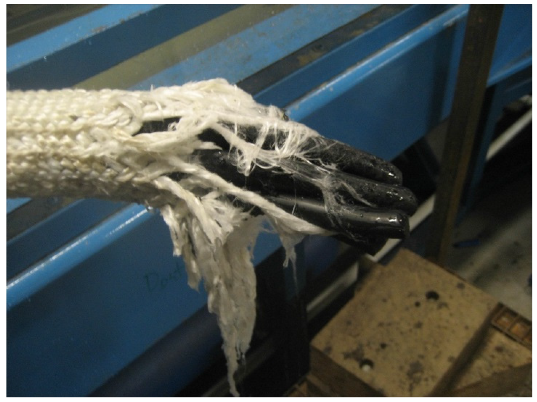 The failure (parting of strands) occurred at the point where the rope increases in diameter to envelop the core bundle. The edge of the core bundle caused fretting which is likely to have promoted this failure, shown in Figure 13.