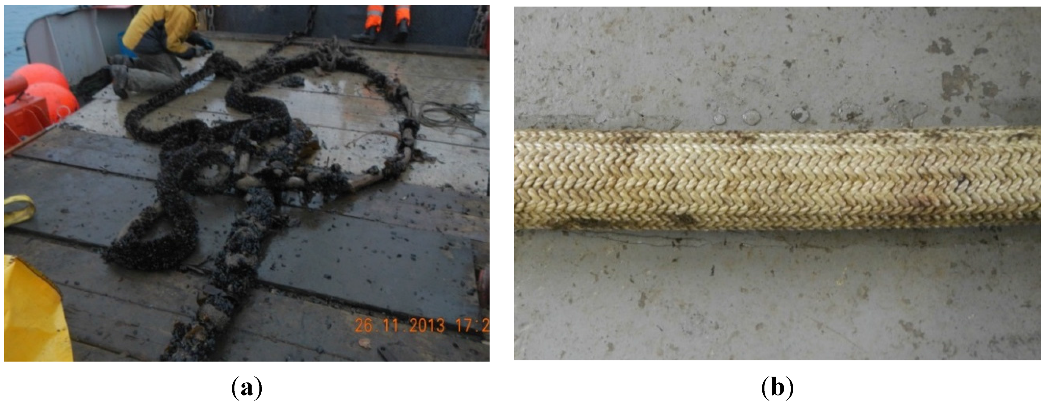 (a) Upper tethers with mussel growth; (b) P1-8 tether after cleaning.