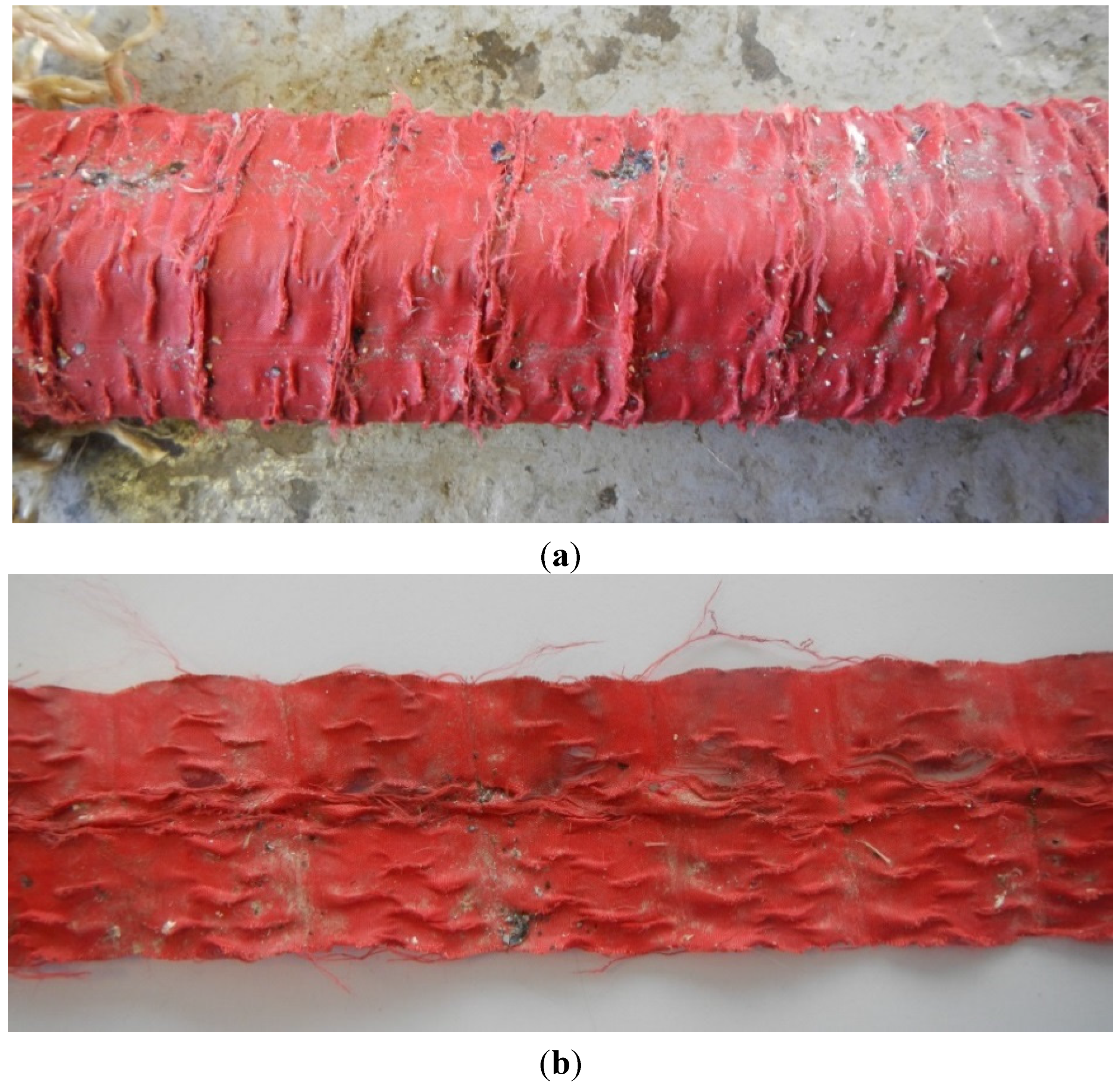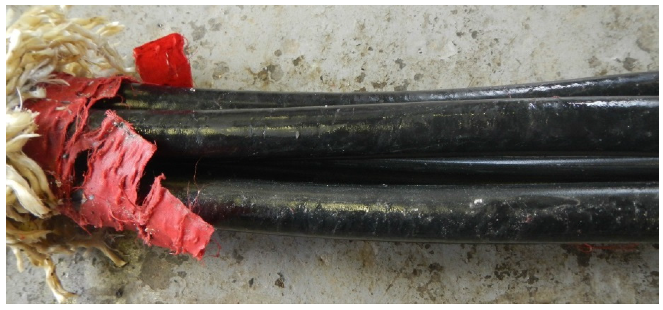 - Anti-friction membrane durability: in addition to the marine growth, considerable degradation had occurred to the Dacron membrane as shown in Figure 17a,b. The edges of the membrane have frayed significantly and “pressure tears” are evident within the membrane. These rough edges create a higher friction surface which could lead to increased levels of wear to the load carrying rope during tether operation. The early stage of this may be detailed in Figure 18 where evidence of the filaments of the rough membrane can be seen in an area of worn rope.