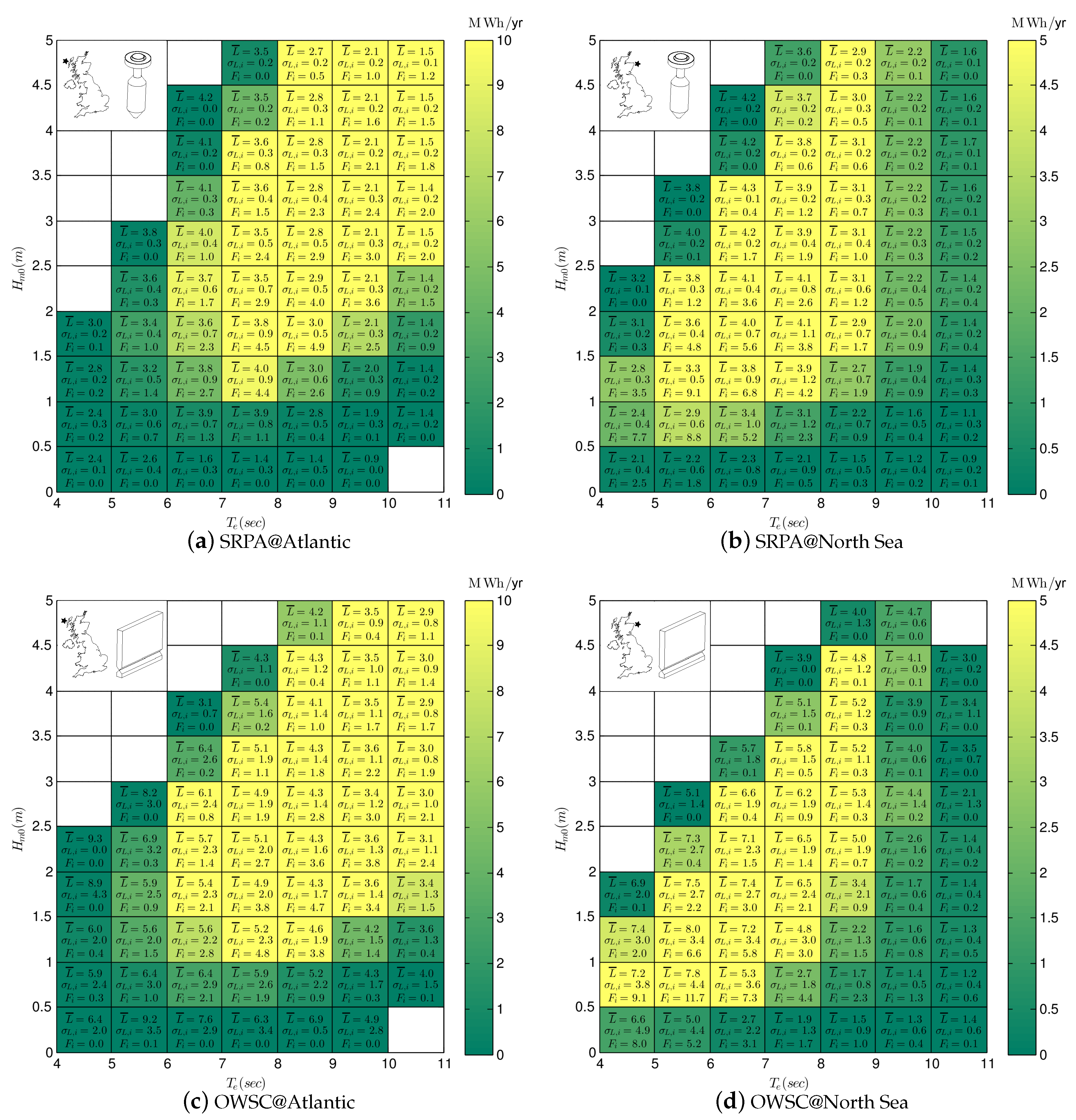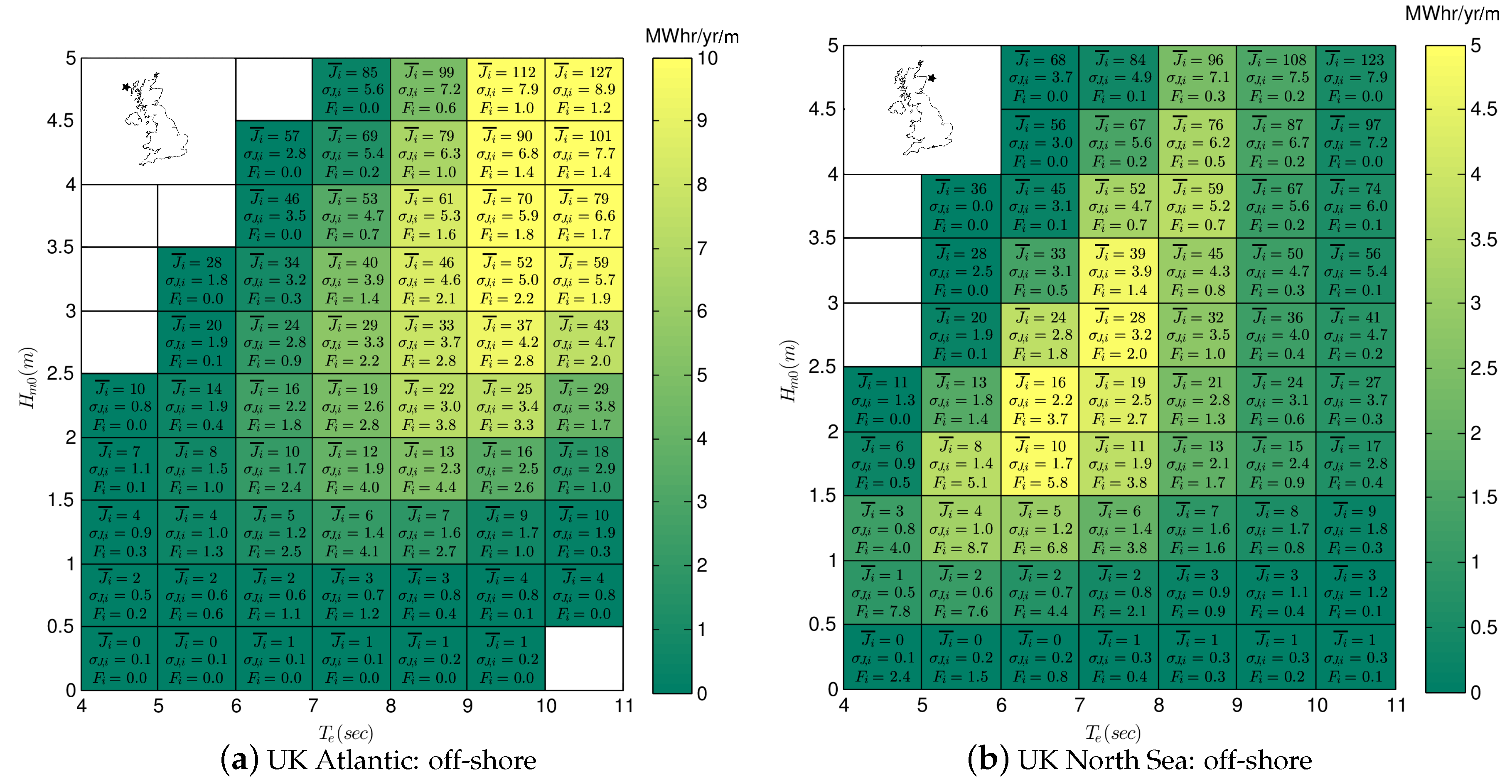 Wave matrices for UK offshore sites. Text indicates mean and standard deviation of wave power (, , in kW/m) and frequency of occurrence ( as a percentage). Color indicates average wave energy in MWhr/yr/m.