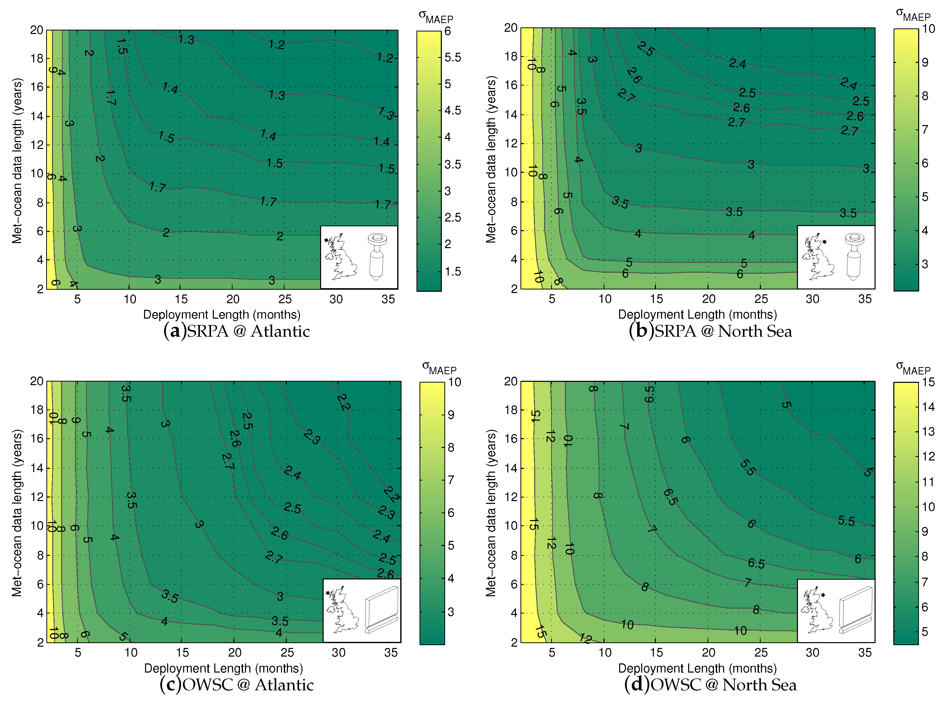 - If a certain maximum level of uncertainty in MAEP is targeted, the minimum required lengths of the historic met-ocean and WEC deployment data-sets will be different for every WEC-location combination.