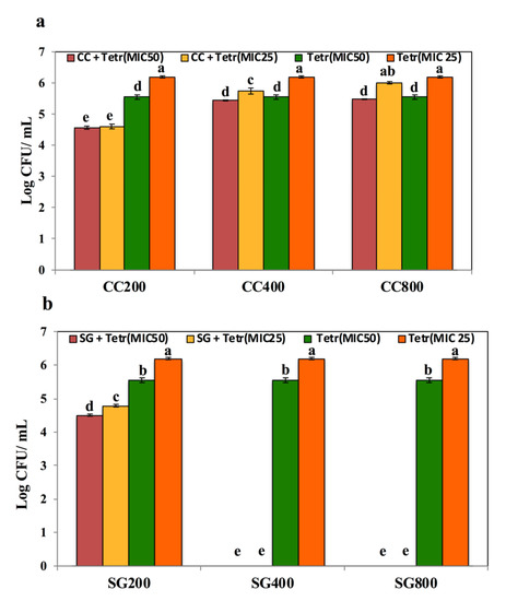 - Hussin, W.A.; El-Sayed, W.M. Synergic interactions between selected botanical extracts and tetracycline against gram positive and gram negative bacteria. J. Biol. Sci. 2011, 11, 433–441. [Google Scholar] [CrossRef]