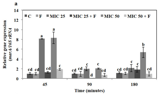 Effect of floridoside (F) on the expression of efflux-pumps related genes of S. Enteritidis. (a) marA (b) ramB (c) acrA after 45, 90 and 180 min of treatment with floridoside (15 μg/mL and Tetracycline (MIC25 and MIC50, 4 and 7.9 μg/mL)). Values with different superscript letters were significantly different (p < 0.05). C: control; F: floridoside; MIC 25: tetracycline at MIC25; MIC25 + F: combination of tetracycline at MIC25 and floridoside; MIC 50: tetracycline at MIC50; MIC50 + F: combinations of tetracycline at MIC50 and floridoside. Values represented mean ± standard deviation from three independent experiments (n = 9).