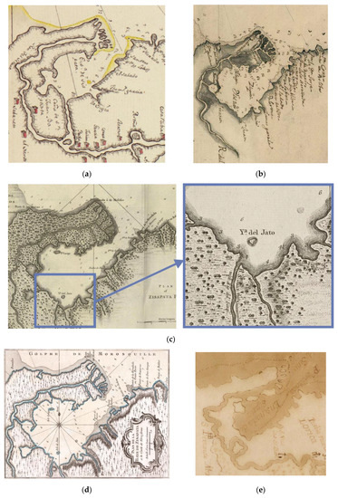 The intense 18th–19th-century siltation of Cispatà bay has evidently overlapping among the different “original” maps: de Herrera y Sotomayor (ante 1732), Fidalgo (1795) and Nokomis and Bushnell (1937–1938) (Figure 14).