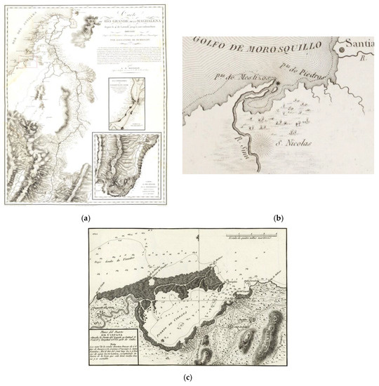 An essential reference for the knowledge of Spanish America is given by the long-lasting hydrographic expedition, which started in the last years of the 18th century and was carried out under the command of Joaquín Francisco Fidalgo [50,51]. This exploration produced, together with reports, small- and large-scale nautical maps dedicated to harbors and bays. These maps show soundings and sea bottom typology. The Derrotero de las Islas Antillas, de las costas de Tierra Firme y de las del seno Mexicano ... 1810 [52] also focuses on the Rio Sinú mouth: it discharges in the inner part of Cispatá Bay and forms a west–south semicircle passing near Cispatá hills and the villages of San Bernardo del Viento (on the left bank) and San Nicolás and Santa Cruz de Lorica (on the right bank).