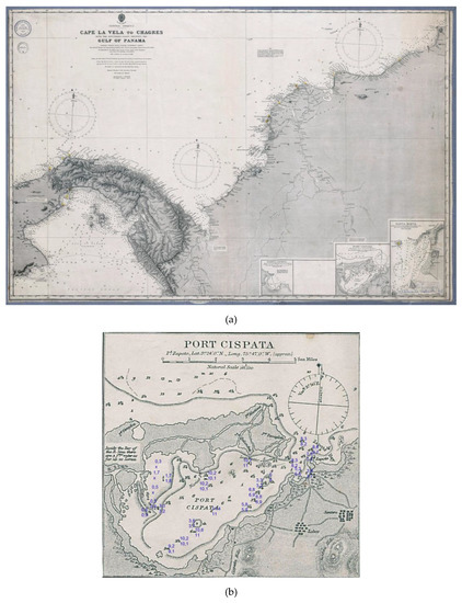 The narrative of the voyage of H.M.S. Herald during the years 1845–1851, under the command of Captain Henry Kellett [66], suggests that Captain Kellet did not see the Atlantic coast of Colombia or Cispatá in particular: from England, he sailed to Tenerife, Capoverde, the Brazilian Fernando de Noronha Island. From Brazil, he set course to Capo Horn to explore the Pacific Coast of South and Central America. His long voyage gave birth to new maps of Colombia’s west coast too, but it is no accident that the 1902 (or later) map (Figure 11a) continues to warn that it is “compiled chiefly from Spanish government charts”; as for Cispata bay, the reference to Fidalgo’s map is now evident.