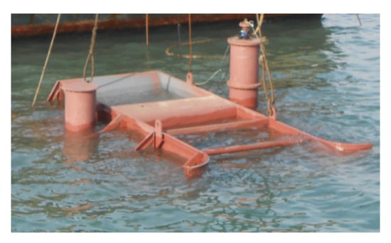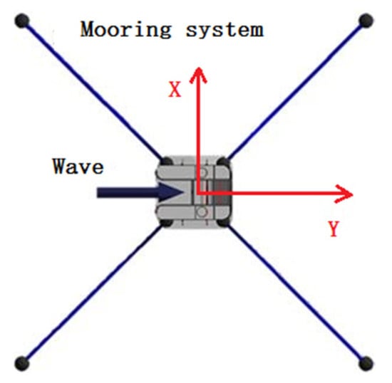 In order to satisfy the progressively rising power demand of China’s coastal sea areas and remote islands, the marine ranch’s needs for new energy, and in order to make more efficient use of marine energy, a new type of horizontal axis rotor direct-drive wave energy generating device has been designed. The device has a capacity of 1.1 kw and weighs about 28 tons, and it has been tested in the Chengshantou sea area in Weihai, Shandong province(see Figure 1) []. The principle of power generation is shown in Figure 2 []. It forms a closed body of water through the entry and exit passage of the cross-flow turbine. As a result of the strike and backflow of the wave, the water body in the passage flows back and forth, and then drives the rotor in the passage to rotate in one direction to make the direct-drive generator produce electricity. The main feature of the device is its direct transformation of wave energy into electricity, which will maximize the efficiency of transformation. The device can float on the surface of the sea by means of four mooring points. Thus, the mooring system is a crucial element that will affect the stability of power generation. However, research on the mooring systems of wave energy generating devices is rare at present. Based on the hydrological data from the new generating devices working in the sea area, the study will simulate the feasibility and stability of a four-point mooring system and verify this through a regular wave test in order to provide a theoretical basis for the manufacture of a power-generating prototype and its reliable supply of power.