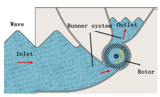 In recent years, the utilization of wave energy has become the hot topic in new energy that coastal countries in the world have focused on. The power-generating device of the horizontal axis rotor is relatively mature in the application of tidal current energy. Industrial groups and power companies in France have employed the OpenHydro turbine technology to build up the first exemplary tidal current turbines. The 150 kw ORPC OCGen® power system that MRE companies in the US developed has also been put into commercial use. Both devices use the horizontal axis rotor to transport the driving force of the impeller to power devices in order to generate electricity []. The Korea Maritime and Ocean University developed a floating horizontal axis wave energy model device. It mainly uses the rise and fall of flanked water that follows the movement of the wave to propel the turbine to rotate, and then transports the driving force to power devices through the force transmitter. An engineering prototype of the device has not yet been created []. Wuhan University and the Chinese Academy of Sciences jointly developed a 1 kw vertical axis tidal current energy generating device and performed marine experiments in the sea area of Zhuhai. Shanghai Ocean University designed a horizontal axis generating device and conducted a series of experiments in the sea areas of Xiamen [].