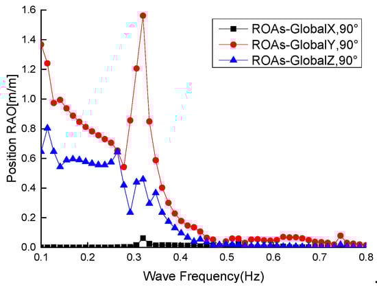 As is shown in Figure 4, when the device is installed at 90 degrees, the value of the RAO in the X direction barely varies with the increase of wave frequency. The value of the RAO in the Y direction firstly rises and then falls as wave frequency increases, and it reaches the maximum value when the frequency is around 0.33 Hz; the wave cycle is at 3 s. The value of the RAO in the Z direction falls gradually with the rise of wave frequency. When the wave frequency approximates 1 Hz, the value of the RAO of the device is roughly equivalent to zero, and the device fails to synchronize with the wave frequency due to the effect of inertia.
