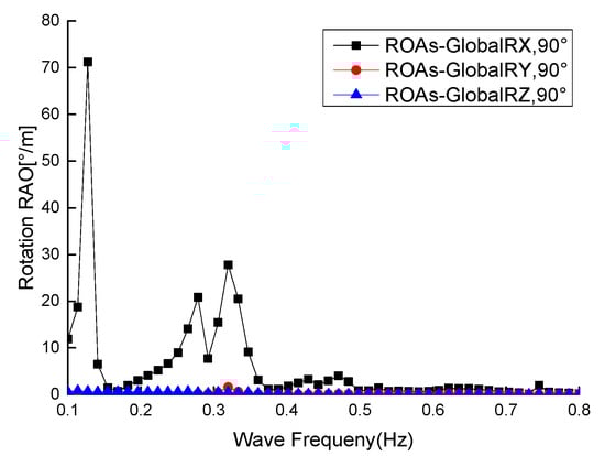 The AQWA software was used to carry out a coupling simulation analysis of the device when the wind, wave, and flows were in the same direction; the following data were obtained: the total length of the single anchor chain was 23.13 m, the cycle of the wave was at 3.9 s, the height of the wave was 0.75 m, the speed of the wind was 6 m/s, and the water flow velocity was 2 m/s. The value of the response amplitude operators, or the RAO in the X, Y, and Z directions varied with the wave frequency, which is shown in Figure 4. Likewise, the value of the RAO in the RX, RY, and RZ directions varied with the wave frequency, which is shown in Figure 5.