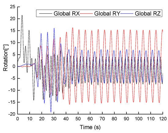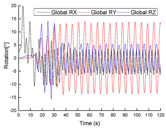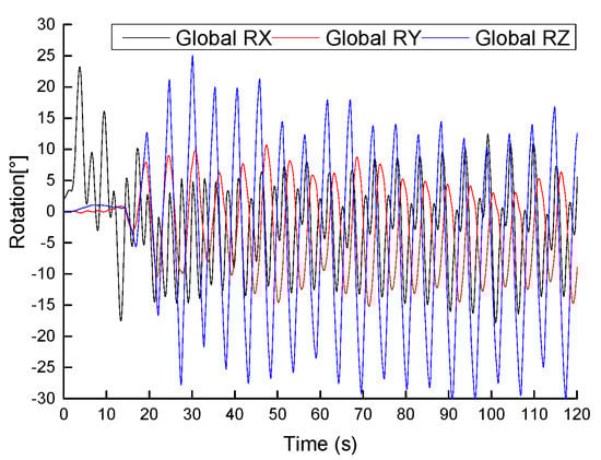 As we can see in Figure 3, in the regular wave simulation, the device is set to face the wave at 90°. In Figure 6, Figure 7 and Figure 8, we can see that the device drifts with the tide for some time at first, and then becomes stable after 25 s with the tension of the mooring system, while its rotation in the RX, RY, and RZ directions also gradually plateaus. As the wave height increases, the angles of RX and RY barely change. That is, the angles of the roll and pitch barely change. The angle of the RZ or yaw begins to grow under the third working condition, and then hovers around plus or minus 18 degrees. Thus, the yaw’s angle gradually becomes large in the same cycle as wave height changes.