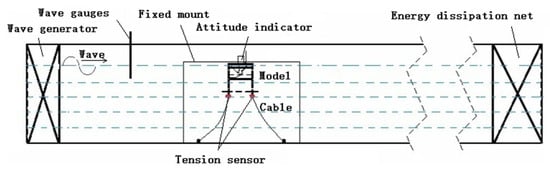 Based on the principle of resemblance and in view of the fundamentals of engineering construction and the condition of the water trough, the tested model was built at a scale of 1:10, and the design of anchor chains was made to resemble the prototype in length, mass, and elasticity. The test of the model was carried out in the wave–current coupling water trough of the National Engineering Laboratory. The installation of the model is shown in Figure 9. The facilities and instruments employed in the experiment include the motion alignment tool, tension sensor, mooring lines, wave height recorder, and current meter. The motion alignment tool was installed before placing the model in the water for testing. The parameters of the model such as its center of gravity, the depth of draught, and the rotary inertia through ballast lead or iron were subsequently adjusted. In view of the wave mass and current reflex caused by the current flowing through the water trough, the model was placed as far as possible, near the center of the water trough. The distance between the model and the wall of the water trough was about 1.7 m, much larger than the diameter of the model; thus, the effect of the wall can be excluded. The experiment is shown in Figure 10.