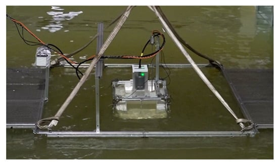 In order to ensure the stability of the device, a four-point mooring method was adopted. That is, four identical gearless anchor chains were used, with the angles between neighboring chains being 90°. The arrangement of chains are shown in Figure 3. The device floats on the sea, and the damping plate under the device connects to the bottom of the sea through anchor chains to ensure the stability and balance of the device when wind wave flows strike it. The water depth of the area where the device is placed is 15 m, and the device´s draft is 4.7 m; thus, the vertical length of the anchor chains is 10.3 m. The weight of the chains is 7/8 of their weight in a vertical position. There are four anchor chains with a total vertical length of 41.2 m. According to the prototype of the anchor chains, a chain’s diameter is 50 mm and its weight is 49.5 kg/m; therefore, the total weight of the chains is 2040 kg, and their weight in the water is about 1759 kg when the buoyant force is excluded [,,].