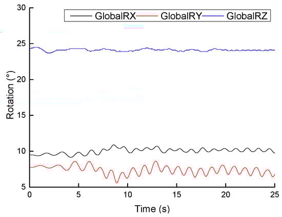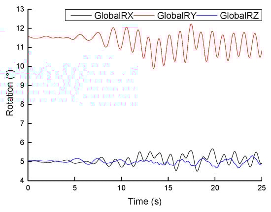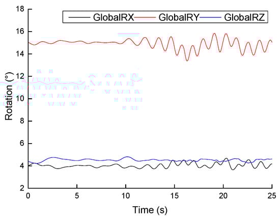 The change of the shaking angle is taken as an absolute value. As shown in Figure 11, Figure 12 and Figure 13, the statistics of the test in the water trough reflects the model’s angle variations in the RX, RY, and RZ directions under different working conditions. The model selects 25 s of experimental time. The model oscillates irregularly before 10 s due to the influence of wave flow, but after 10 s, the model gradually becomes stable on the whole.
