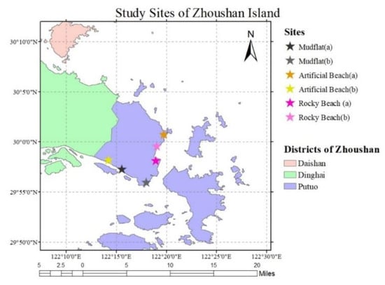 Zhoushan Island is the main island of the Zhoushan archipelago located in the coastal area of eastern Zhejiang province of China. In recent years, the government acknowledged the importance of the development and utilization of marine resources in this area []. Zhoushan is focused on cultivating and developing marine industry as the center of marine economy development with the Zhoushan Archipelago New Area designated as a state-level economic reform pioneer zone in the national strategy [,]. The rapid development of the economy caused the increase in household and industrial waste that degrades the environment. Policymakers need to understand how societies can develop strategies to adapt and continue to develop in such change. Social-ecological scenario studies can inspire and facilitate adaptive governance through dialogues with decision-makers and other stakeholders []. Where the scenarios should be grounded in data concerning both the natural and the social sciences []. As Zhoushan Island is surrounded by sea at the southern flank of the Yangtze River estuary, the beaches consist of different landforms with complex litter pollution. Accordingly, to implement waste management more effectively, it is imperative to understand the distribution and source of beach litter.