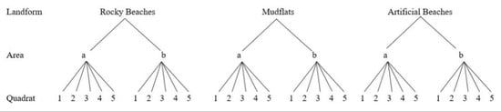 The method of stratified random sampling (StRS) was carried out in the field survey on Zhoushan Island. StRS is widely used in marine litter surveys [,,,]. UNEP also recommended that the location of sampling sites for beach litter assessment should be stratified []. A well-designed StRS scheme can achieve relatively precise and accurate estimates with reduced sample size compared to other sampling methods []. Considering that different landforms may have different litter, and for long-term monitoring survey purposes, we divided the landforms into mudflats, artificial beaches, and rocky beaches. Two areas (a and b) were randomly selected and inspected on each of the three landforms. Furthermore, according to the survey site conditions, five quadrats (5 m × 4 m) were also randomly selected from each area to investigate the distribution of beach litter in each landform. All litter was collected and counted in each quadrat.