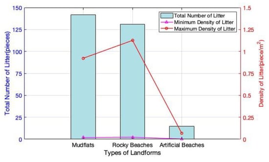 As litter was not weighed in this survey. Formula (1) was used to calculate the quantity density of litter in each district. The litter density of each sampled quadrat from the three types of landforms and the average density with sample standard deviation are presented in Table 3. Based on the total amount and quantity density of litter in each district, the double-coordinate Figure 3 was created. The red line represents the maximum density of debris in each landform, while the pink line represents the minimum density of debris. It can be noticed that mudflats had the largest amount of litter, yet rocky beaches had the largest density. Artificial beaches had both the least amount of debris and the least density.