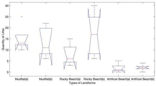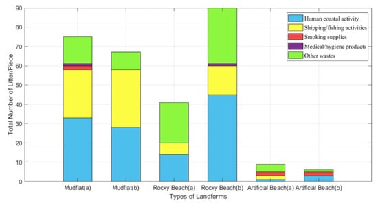 The results showed that the distribution of litter in different landforms was significantly different, while the distribution of litter in different sampling points was not significantly different. A classification method of NOWPAP was used to classify the sources of litter, and the results showed that most of the litter was generated by human coastal and fishing activities. Three litter types with the largest proportion were plastic, fabric, and metal litter. Since this survey mainly focuses on the coastal litter, it is speculated that the litter may be generated by coastal activities and then drifted to the shore, or it can be caused by human activities on the shore. Taking into consideration the results of the present study, different clean strategies can be applied to different landforms. Furthermore, a strategy should emphasize a systems approach addressing not only cleaning up litter but addressing the source of litter and making progress against the root causes of the problem [].