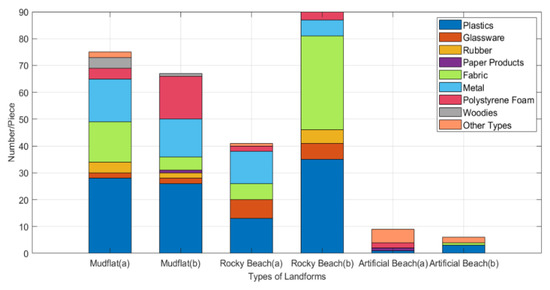 This study found that plastics, fabric, and metal are the most common types of litter in mudflats and rocks (Figure 5). These kinds of litter are most likely to be found in fishing boats and construction sites. Typhoons, storms, and other inclement weather can wash up the plastic buried inland or unburied litter into the sea []. Furthermore, there is a lack of awareness about marine environmental protection and people in the shipping industry dump their litter into the sea. There are other examples of how the litter ends up on beaches and in the sea: the cargo ship was caught in a storm and containers fell into the sea; lighter materials, such as plastic and foam, were carried away by the ocean currents; people traveling on holidays and living by the sea throw rubbish away; the trash is carried into the ocean by currents, monsoons, and tides and pushed back onto beaches and rocks. Figure 5 shows that the amount of rubbish on the artificial beach was significantly less than that of the other two types of landforms, which is speculated to be because the artificial beaches were regularly supervised and cleaned.