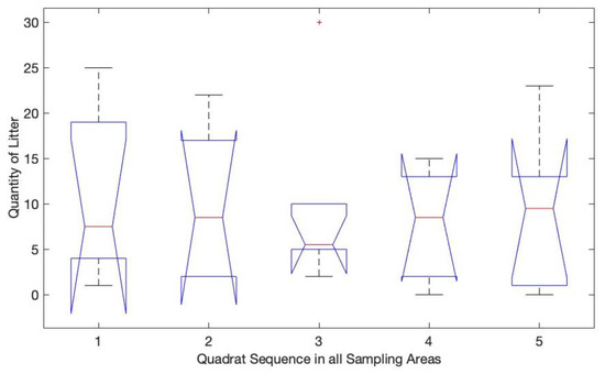 Figure 6 and Figure 7 show the comparison intervals for the mean litter density for different landforms and different sampling points. In the figures, the red bars represent the median value, the black bars represent the maximum and minimum value of the sample, the blue bars represent the upper and lower quartile of the sample, while the range between upper and lower conner points represents a 95% confidence interval of the litter density distribution. Figure 6 shows significant differences in the distribution of litter in different landforms (p = 0.0006), while Figure 7 shows no significant differences in the distribution of litter in different sampling points (p = 0.9854).