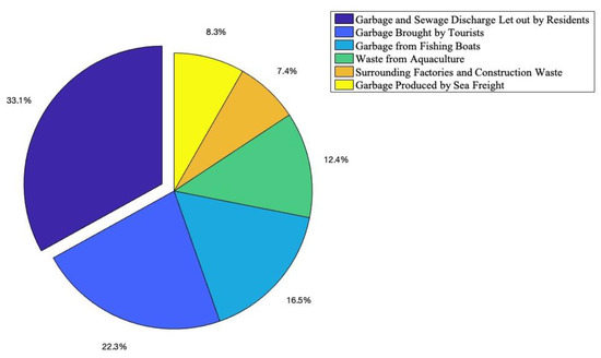 Zhoushan Island has undergone visible changes due to litter pollution. Most of the survey participants think that the litter created by residents is the main source of marine litter. Furthermore, the marine litter is also created by tourists, fishing activities, aquaculture, industry, and sea freight (Figure 8).