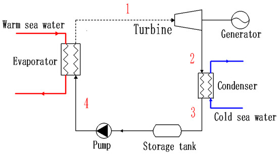 Figure 1 shows a schematic diagram of the ocean thermal energy conversion cycle. The liquid working fluid from the condenser is pressurized by the pump, enters the evaporator, absorbs heat from the warm sea water, and becomes saturated or superheated steam. The steam then flows into the turbine, where it is expanded to generate electricity. Finally, the exhaust gas of the turbine is condensed into liquid by the cold sea water through the condenser.