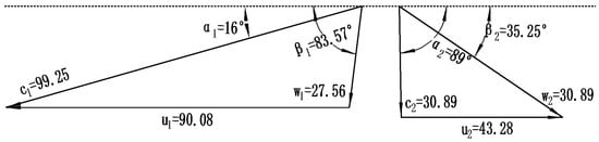 In the process of one-dimensional initial design and thermal calculation of the turbine, the internal flow can usually be regarded as a steady-state flow that ignores the temperature change of specific heat and isentropic exponent, adiabatic and inviscid []. The gas first expands and accelerates in the nozzle, which increases the gas velocity at the nozzle outlet to . Then, the gas rotates into the rotor at a high relative speed of . The circumferential velocity of the blade is , and the gas continues to expand in the blade. The relative velocity of the airflow in the outlet is called , and its absolute velocity is the vector sum of the velocities and at this point.