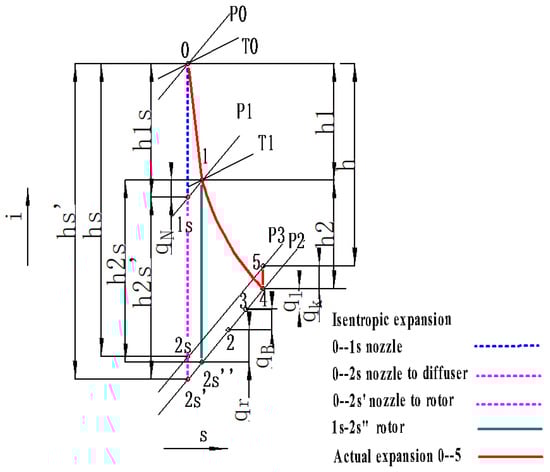 Aiming at the application characteristics of marine thermal energy conversion in a small temperature difference environment and the special thermophysical properties of the organic working fluid in this environment, the aerodynamic design and optimization of this turbine are carried out combined with the design ideas of ORC radial turbine [,]. The overall working process of the centripetal turbine is shown in Figure 2. Firstly, working gas flows into the volute at a certain speed which is evenly distributed to the nozzle vanes; then, the gas enters the nozzle to expand, making part of the internal energy convert into kinetic energy (0–1), of which the pressure decreases, the temperature decreases and the speed rises. Next, the gas accelerated by the nozzle enters the rotor at high speed to push the rotor to rotate, driving the motor to generate electricity, while the gas continues to expand in the rotor, completing the internal energy to mechanical energy transition (1–2). Finally, the working fluid flows out of the turbine to the pipeline after passing through the diffuser.