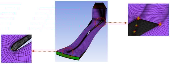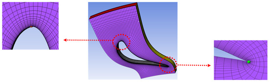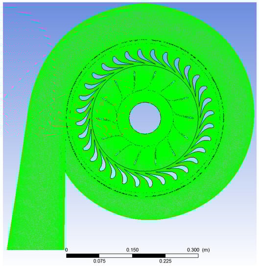 The geometry of the turbine is exported to ANSYS-BladeGen to generate the nozzle and rotor channels. Ansys-TurboGrid is used to generate O-H three-dimensional computational grids, as shown in Figure 5 and Figure 6, where the “automatic topology and meshing (ATM optimization)” option is used in the stator and rotor flow channels. It can generate high-quality grids and avoid negative volumes, which is a problem for traditional grid generation []. The volute is divided into a tetrahedral mesh, and the volute tongue is locally encrypted. The overall mesh after importing into CFX is shown in Figure 7. This initial mesh was found good enough to run pioneering simulations of the 3D candidate R134a radial-inflow turbine in high flow conditions and establish the complete methodology (thermodynamic cycle, meanline analysis and preliminary viscous CFD simulations).