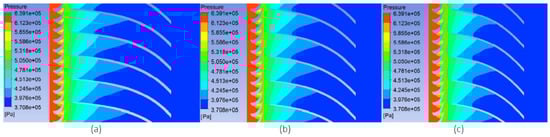 Pressure cloud diagram under different blade heights: (a) 25% of the blade height; (b) 50% of the blade height; (c) 75% of the blade height.