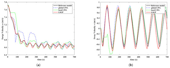 From the above simulation results that the LSGP algorithm has a certain prediction simulation effects, and low requirements for training data. This property is determined by the nature of the LSGP algorithm. It is the main line of this paper to predict the external force of the ship through identification modeling, and to further calculate the trend of the ship’s motion at the next moment according to the Equation (25) in real time, and then to predict the state and trajectory of the ship’s motion. The simulation prediction results of the mariner test are shown in Figure 7, Figure 8 and Figure 9, and a comparison based on the two LWL (global LWL [9], local LWL [22]) algorithms is also given.