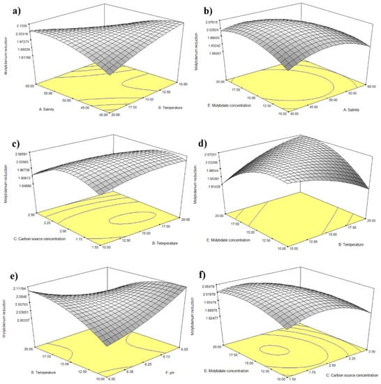 Figure 7a,d show the interaction between the pairs of variables, AB, and BE, respectively. These figures illustrate the optimum temperature for strain AQ5-A9 ranging from 10 to 20 °C, confirming its psychrotolerant characteristics. This supports the potential use of this strain for Mo reduction in cold regions during summertime [46]. Zhou et al. [47] stated that the presence of a clear peak in the centre of a response surface plot suggests a mutual relationship between the two variables, as depicted in Figure 7b,c,f. Figure 7b illustrates the interaction between salinity and molybdate concentration, with optimum Mo reduction between 40 and 50 ppt salinity and 15.0 and 17.5 mM molybdate concentration. Increasing the salinity above 50 ppt reduced the reduction of Mo. As noted above, varying salinity results in osmotic and specific ion effects on microorganisms, affecting their activity and biomass [38,48].