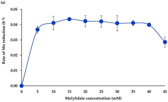 Simple carbon sources like glucose and sucrose are commonly favoured by microorganisms. Mo reduction is associated with growth and requires enzymes(s) from bacterial metabolism; hence, it is best supported by the same simple carbohydrates that sustain most bacterial metabolism and growth [37]. These substrates are preferred as electron donors as they can produce reducing equivalents for NADH and NADPH and are the substrates for Mo-reducing enzymes [19,39]. Studies have reported that optimum sugar concentrations are between 1.0 and 2.5% [17,36]. At higher sugar concentrations, the observed decrease in Mo reduction is likely a result of osmotic stress.