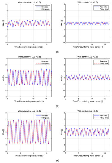Both the case where the controller was applied and the case where the controller was not applied were performed under the conditions of wave direction 180° and 8 regular wave frequencies. Figure 13 shows the comparison results of regular wave tests without control and with control cases. The fitting data means the result of using the least square method assuming that the frequency of pitch motion is the same as the wave encountering frequency as sinusoidal fluctuation . Here, denotes the amplitude of pitch. The pitch is divided by wave steepness to express dimensionless motion angles, and the time is divided into an encountering wave period to make it dimensionless. The encountering wave frequency and period are expressed as Equations (14) and (15), respectively.