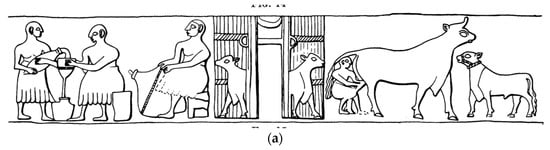 Calving became a metaphor for human delivery. The incantation “A Cow of Sin”, which goes back to the Ur III period, was recited for the woman in travail. It relates that moon god Sin lusted for a cow, mounted her and impregnated her. When the cow was due to give birth, labor pangs gripped her and became too exhausted and unable to deliver the calf until the moon god sent two spirits to assist her and she finally gave birth. The supplication is that like the cow, the woman in labor should give birth easily. Niek Veldhuis drew attention to the word-play in the incantation, littu “cow” a pun for ālittu “childbearing woman”, and arḫu “cow” placed in chiastic position to the homonym arḫu “month” (). Birth incantations of the Cow of Sin, or incantations containing references to cows and cattle pens used during childbirth to accelerate the delivery and protect the newborn child, are attested in the second millennium BCE, not only in Mesopotamia but also in Ugarit and Anatolia (). The reference to the cow must reflect observations of calving, which has the potential of being very exhausting and strenuous for the cow, and it is possible that the cow gives up on the delivery. Soon after the calf is born, it is up and nurses. An Akkadian seal found, at Tell Brak, graphically picturing the stages of calving and nursing could easily have served as a prophylactic amulet for childbirth (Figure 20). The image of the cow-suckling-calf became a metaphor for motherly love and care of which an Egyptian tableau on the sarcophagus of queen Kawit (c. 2051–2030) from Deir el-Bahri is a visual manifestation. In this milking scene, the cow sheds a tear in distress, because she cannot suckle the newborn calf, tied to her left front leg, while a herdsman milks her for his own purposes (). From the New Kingdom on, the Egyptian expression “to feel compassion, to love” 3mś was written with the cow-suckling-calf signifier (), a “mute” hieroglyph that provided additional information about the word (), namely the phenomenon of the cow’s feelings for her calf as a graphic icon for love. Telling is the passage in the Baal myth, where the loving virgin Anat (rḥm ‛nt) longing for Baal is described in terms of a cow’s love for calf or a ewe’s love for her lamb (). The design of an Old Babylonian seal picturing the storm god on his lion dragon, brandishing the lightning fork, together with the cow-suckling-calf alludes to the god’s dispensing rains, thus assuring the fertility of the land, as well as the procreation of animals and humans alike (Figure 21).
