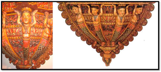Nāga or nagini sculptures were salient as protectors of the entrance to the temple and its sanctum (dvārapālakās) (Figure 18, Figure 19 and Figure 20).