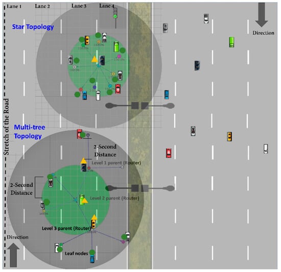 Looking into road parameters such as the safety distance between two vehicles traveling in the same lane, number of lanes, and the road stretch can provide the required analysis for the vehicular network. The capacity of a given lane, the capacity of the road, distribution, and density can reflect the possible size of a vehicular group that can be distributed and accommodated on the road. Additionally, the possibility of the network to have multi-levels/hops can be correlated with a given communication protocol and the road stretch. The size of each hop can be related to the overall road capacity. The highway is chosen as a use case scenario due to the continuous flow of vehicles with various speed limits. Figure 1 below depicts an example of a highway scenario where vehicles are distributed over four lanes within a given stretch. The distance between two vehicles (safety distance) is denoted as a two-second distance. A one-way road is considered for communication to avoid any interference between the two directions. The tree topology reflects the levels of connectivity represented by router level 1, router level 2, and router level 3 along with nodes configured with leaf functionality being the child of the parent node.