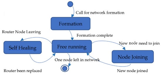 - Self-Leaving: this process also depends on the type of node that may leave the network. The departure of a leaf node can be from any level of the self-formulated network that will not cause disruption to the network. Therefore, the sub-state of leaf node departure needs to transit to the network update sub-state that is part of the self-healing state. The departure of a router node at any level of the self-formulated network may cause network disruption, depending on its level. Therefore, the sub-state of router node departure needs to transit to the network recovery sub-state that is part of the self-healing state.