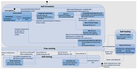 - Self-Formation: this is a compound state that has sub-states running; these are the fitness model, assigning cluster head (CH), cluster head at level 1 (L1), connected child node ID to cluster head, rest of router nodes, a router ID (RID) at level n (Ln), and connected child node ID to router ID at level n. The fitness model sub-state is initiated by exchanging data among the nodes, leading to calculations of the sub-state which has as its entry a data set to perform the required calculations. The outcome of the calculations are the fit values that can trigger the transition to the sub-state of router nodes ID with their fit values. The fitness model sub-state transits to assigning the cluster head sub-state where the entry is the set of fit values to perform, assigning the fittest value as the cluster head. Now that the cluster head has been assigned at level 1, this sub-state can check the cluster head capacity and exit this sub-state to connect to child nodes. The transition to the connected child nodes sub-state is conditional, as the cluster head capacity should be available and the cluster head is close to the nodes. Some of the nodes connected to the cluster head are routers that need to be assigned according to the levels of the network. Therefore, the transition from the connected child node sub-state is triggered when there is a router node as a child, and hence level 2 to level n can be taking place in the network. After the router ID at level n has been assigned, it will also check its capacity to connect to the available child nodes.