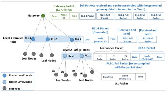 From a packet format point of view, the packet format has an impact on the node selection within each phase of the vehicular grouping approach (such as a replacement router node for the departed one). Hence, every router node within the network, regardless of its level, should have the same packet format, which promotes consistency in selecting a node, be it at a lower or upper level. The size of the packet depends on the communication protocol such as Wi-Fi to offer the appropriate format in which to load the packet with the required data. Within the multi-hop approach, a mixed mode of a given hop dealing with lower-level router(s) and leaf node(s) can be applied. This can affect the packet format that needs to be sent to the upper levels of the network. Hence, the packet format of a router includes the data of its connected leaf nodes and its own data, taking into account the protocol used in the network design to comply with the packet size. As shown in Figure 4, node RL1-1 receives data from RL2-1 and RL2-2 and sends them as they are to the upper level. It also generates the packet related to its own data.